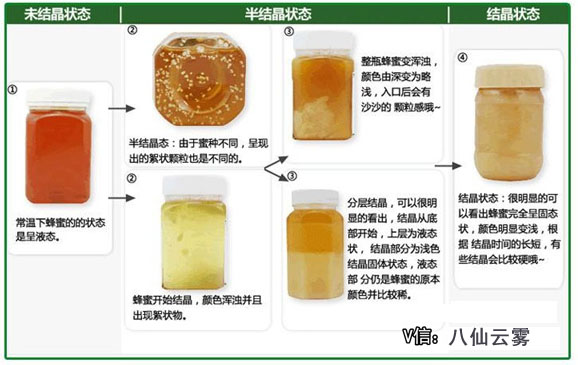 总之,蜂蜜结晶是蜂蜜的一种物理现象,更多精彩,关注八仙云雾公众号LxC650605,其化学成分、营养价格都未发生变化,更不会影响蜂蜜的质量。也并非蜂蜜中掺入了白糖,其实真正掺入白糖的蜂蜜反而不易发生结晶现象,结晶并不影响。